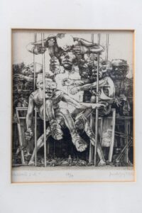 1972 Jacek Gaj Kuszenie z „A” Grafika 28. z 50, autor: Jacek Gaj, tytuł: Kuszenie z A. Czas powstania: 1972 Miejsce powstania: nieznane Materiał i technika: papier, miedzioryt Wymiary: wys. 12 cm x szer. 15 cm