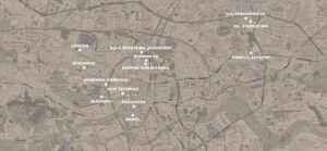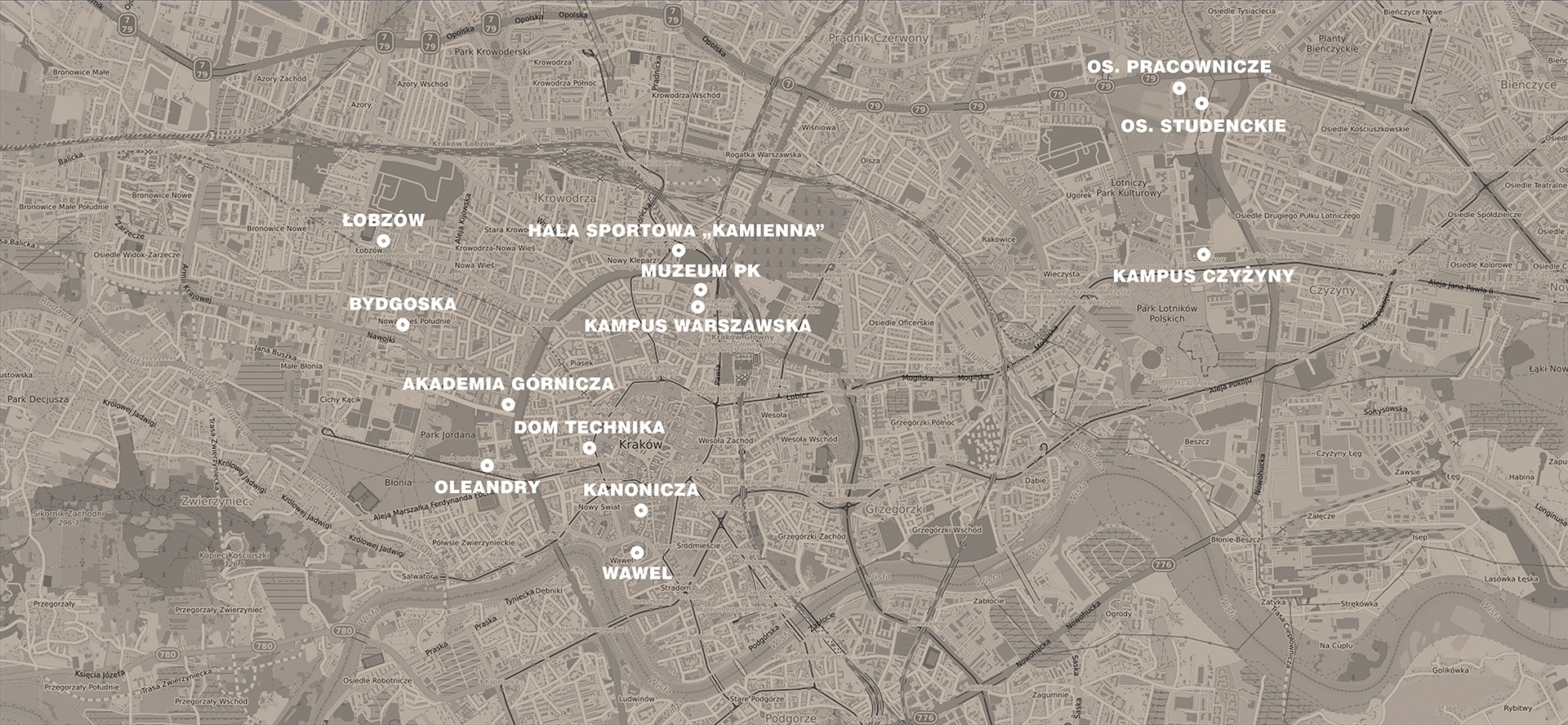 Mapa przedstawia lokalizacje budynków związanych z Politechniką Krakowską.