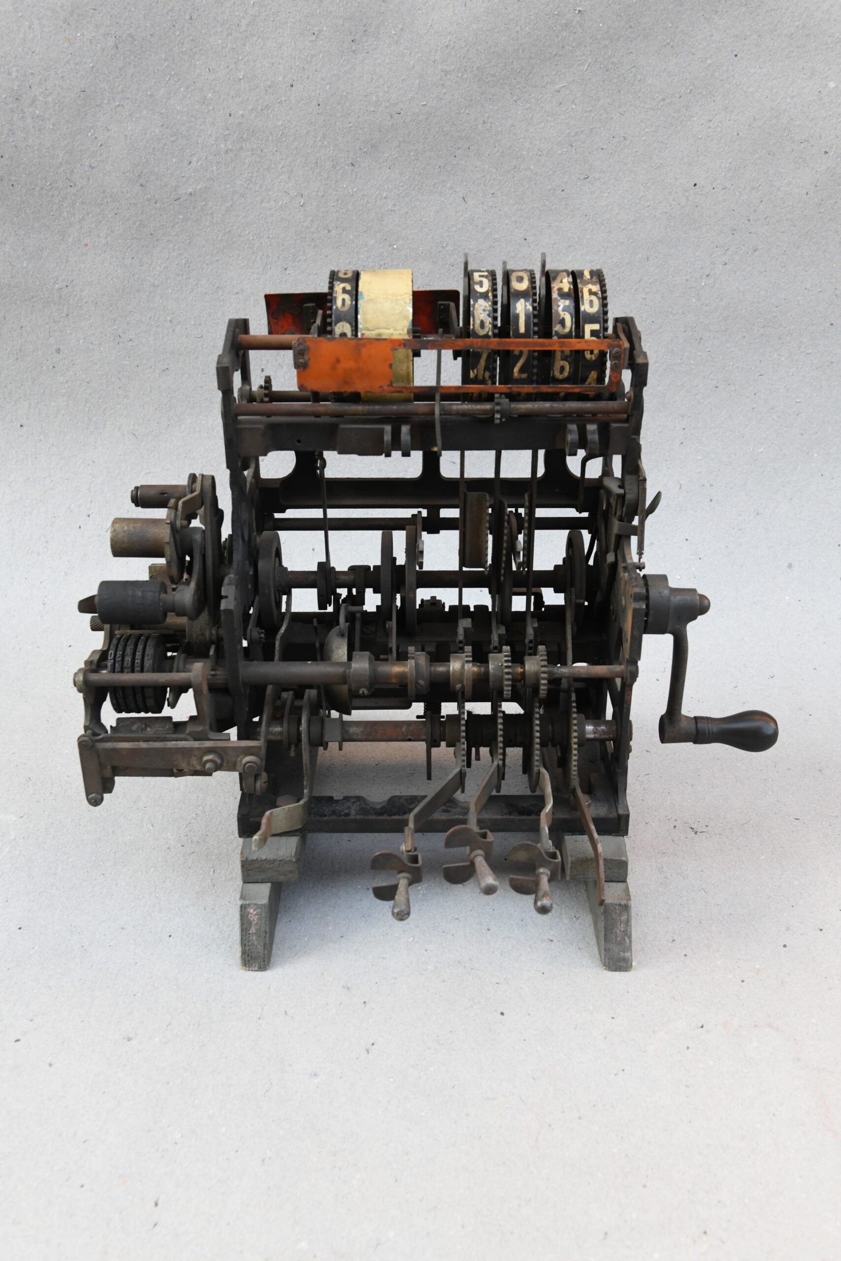 I poł. XX w. Kasa sklepowa Jeden z pierwszych mechanizmów kasy sklepowej Jeden z pierwszych mechanizmów kasy sklepowej, wykonany ze stali z drewnianą podstawą. Przekazany przez Zakład Teorii Mechanizmów i Manipulatorów Instytutu Konstrukcji Maszyn PK. Używany w pierwszej poł. XX w. Czas powstania: pocz. XX w. Miejsce powstania: nieznane Materiał: stal, drewno Wymiary: wys. 42 cm x szer. 44cm