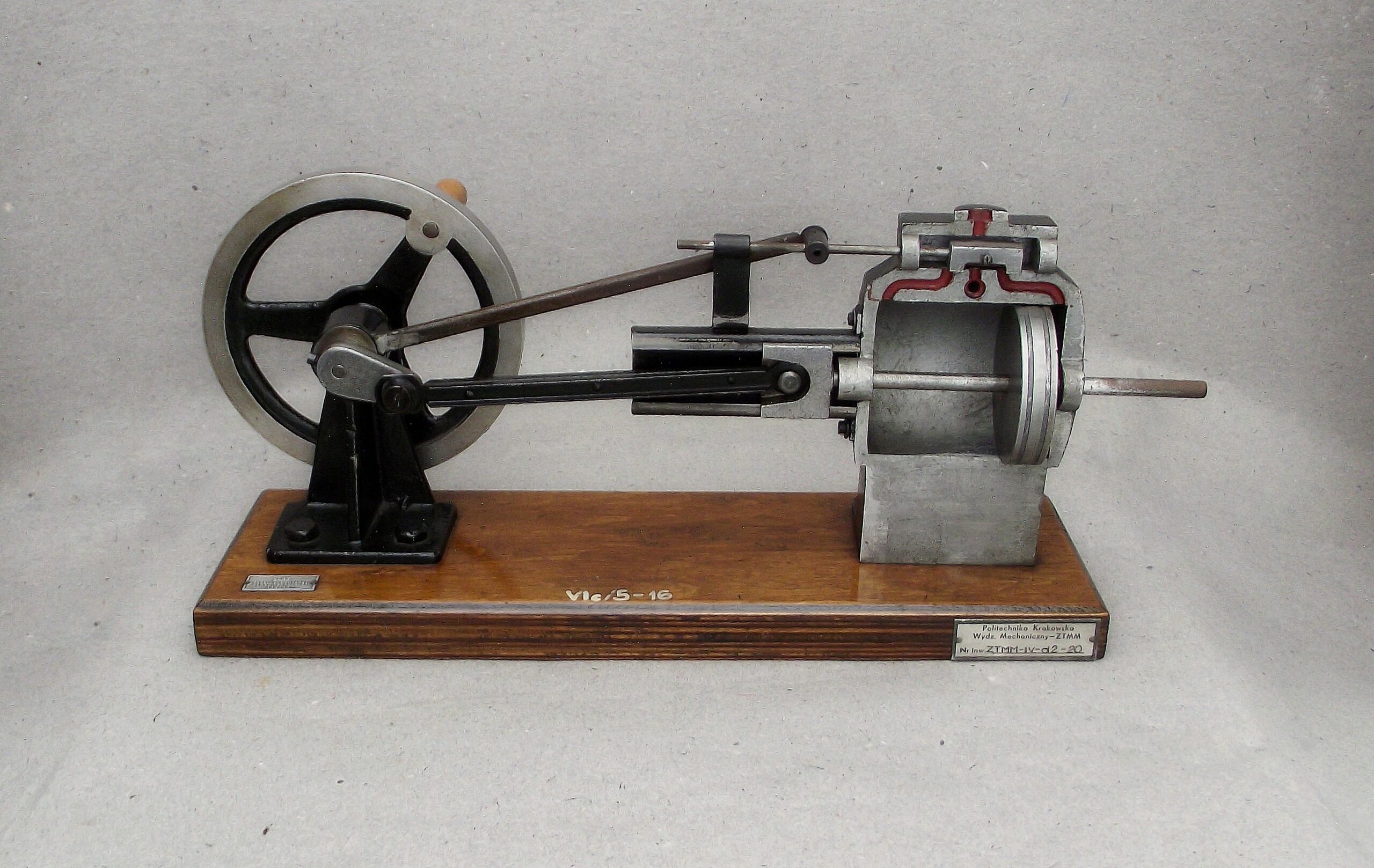 lata 70/80 Silnik parowy Model Model silnika parowego z drewnianą podstawą, wykorzystywany jako pomoc dydaktyczna, na Wydziale Mechanicznym Politechniki Krakowskiej, przekazany przez Zakład Teorii Mechanizmów i Manipulatorów Instytutu Konstrukcji Maszyn PK. Czas powstania: lata 70/80 XX w. Miejsce powstania: Polska Materiał i technika: żeliwo, stal, drewno Wymiary: dł: 42 cm, szer. 16 cm, wys. 24 cm