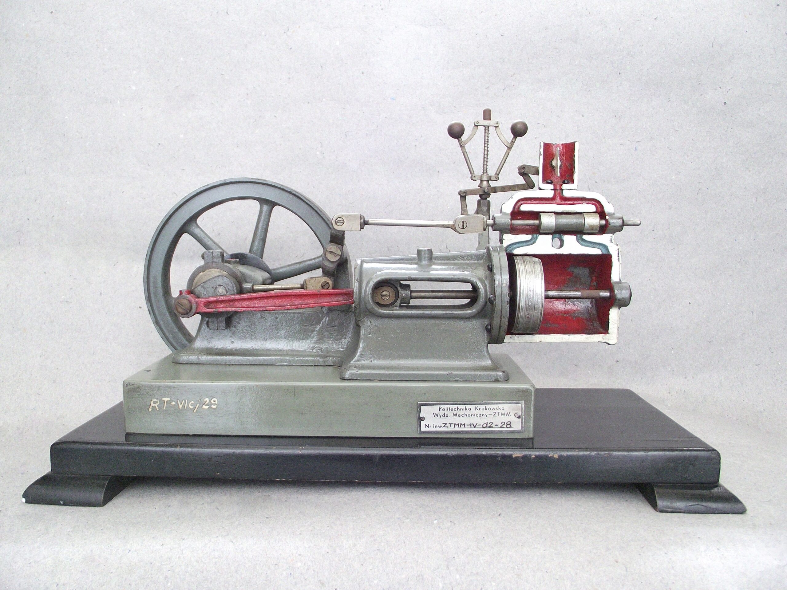II poł. XX w. Maszyna parowa Model wykorzystywany jako pomoc dydaktyczna, na Wydziale Mechanicznym Politechniki Krakowskiej, przekazany przez Zakład Teorii Mechanizmów i Manipulatorów Instytutu Konstrukcji Maszyn PK. Czas użytkowania: druga poł.. XX w. Miejsce powstania: Polska Materiał i technika: metal, drewno Wymiary: dł. 62 cm, szer. 32 cm, wys. 37 cm.
